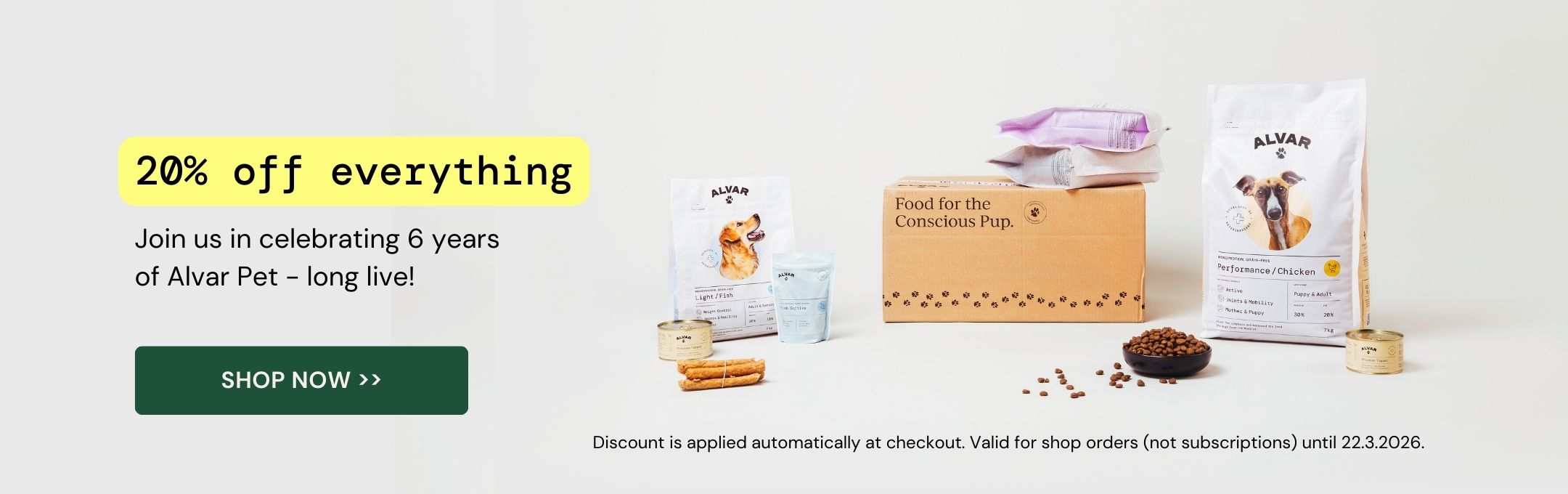 Most of all I appreciate Alvars effort to reduce green house gas emissions and care for a living future on the planet. Also my dog likes the food and is healthy on the diet for some years now. It's easy to order and do changes in the order if needed.